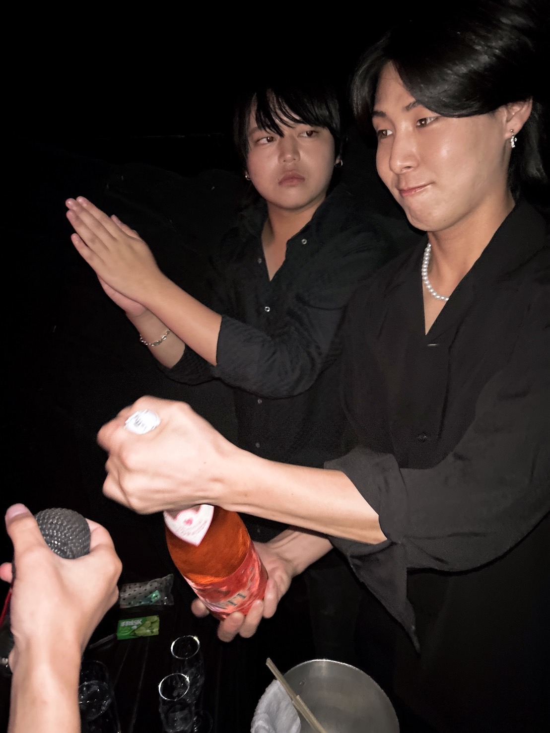 鮮やかな赤い和装で登場した主役は、豪快にボトルを開け、仲間たちの歓声に包まれながら特別な一夜を盛り上げました🍾🔥